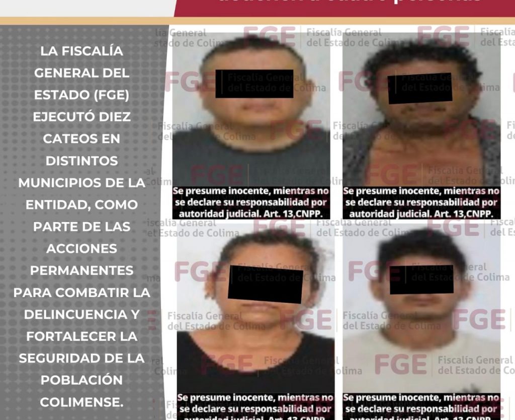 La Fiscalía General del Estado (FGE) ejecutó diez cateos en distintos municipios de la entidad, como parte de las acciones permanentes para combatir la d3lincu3ncia y fortalecer la seguridad de la población colimense.