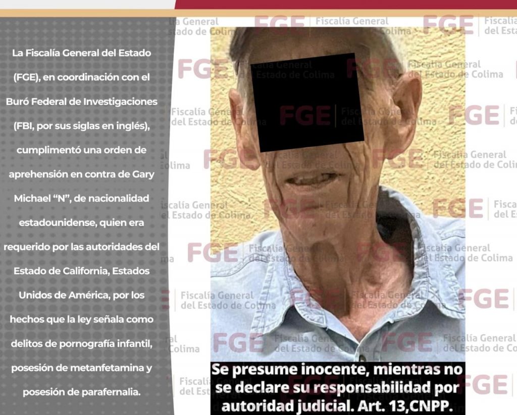 La Fiscalía General del Estado (FGE), en coordinación con el Buró Federal de Investigaciones (FBI, por sus siglas en inglés), cumplimentó una orden de aprehensión en contra de Gary Michael “N”, de nacionalidad estadounidense, quien era requerido por las autoridades del Estado de California, Estados Unidos de América, por los hechos que la ley señala como delitos de p0rn0gr4fí4 infantil, posesión de m3t4nf3tamin4 y posesión de p4r4fern4lia.