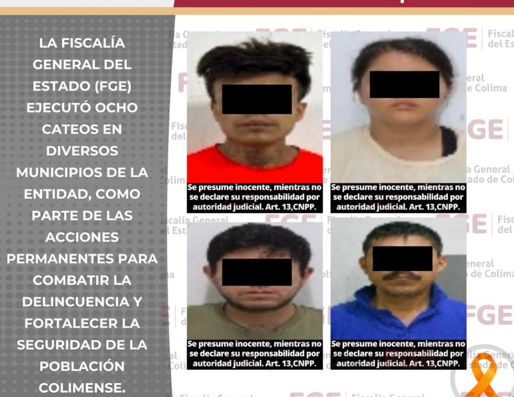 La Fiscalía General del Estado (FGE) ejecutó ocho cateos en diversos municipios de la entidad, como parte de las acciones permanentes para combatir la d3lincu3ncia y fortalecer la seguridad de la población colimense.