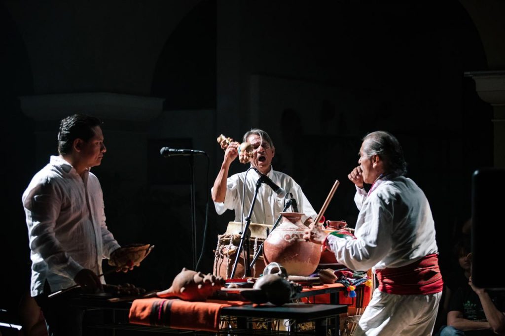 Entre el aroma a copal, la presentación de esta noche fue diseñada para diluir los límites entre el espacio escénico, el público y el área de exposiciones, creando una atmósfera inmersiva y multisensorial para los espectadores que, incluso, fueron invitados a participar cantando, danzando y tocando el tradicional teponaztli. Las piezas interpretadas por los músicos durante la presentación fueron desde temas propios de los rituales de la época prehispánica, hasta piezas más contemporáneas de compositores como el holandés Louis Andriessen o el colimote, Gilberto Moreno Ramos.