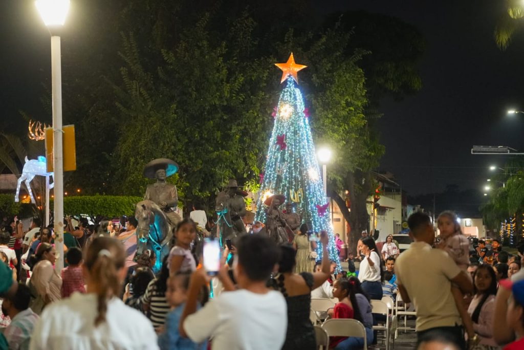 Villa de Álvarez, Col.- La Presidenta Tey Gutiérrez Andrade encabezó el encendido del Árbol de Navidad y de las luces de los arreglos navideños en el Jardín Principal de Villa de Álvarez, que sirvió de marco para realizar un festival en el que se presentó el Show de Betún.