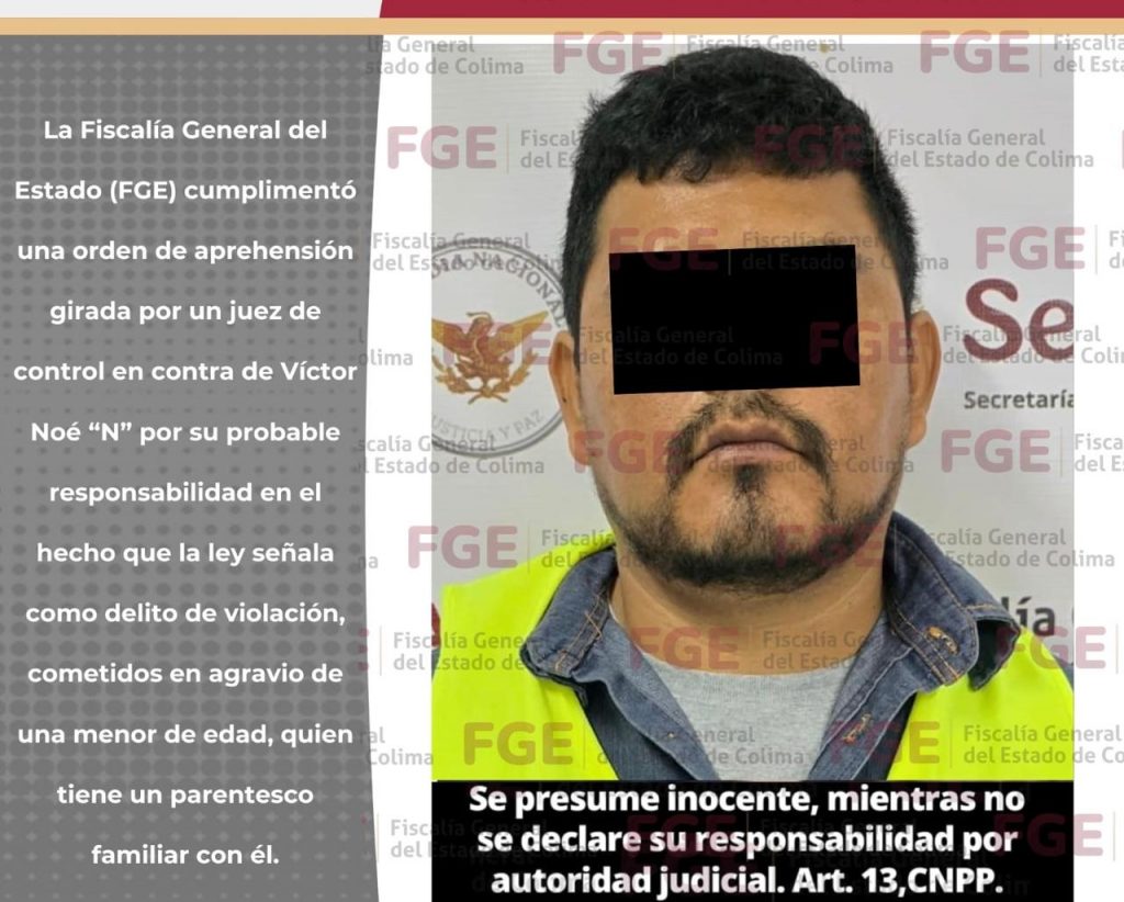 La Fiscalía General del Estado (FGE) cumplimentó una orden de aprehensión girada por un juez de control en contra de Víctor Noé “N” por su probable responsabilidad en el hecho que la ley señala como d3l1to de v10l4ción cometido en agr4v1o de una m3nor de ed4d, quien tiene un parentesco familiar con él.
