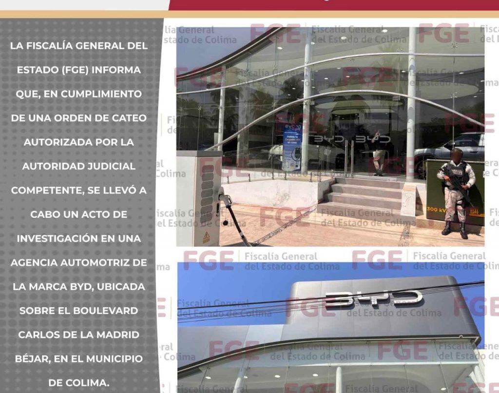 La Fiscalía General del Estado (FGE) informa que, en cumplimiento de una orden de cateo autorizada por la autoridad judicial competente, se llevó a cabo un acto de investigación en una agencia automotriz de la marca BYD, ubicada sobre el boulevard Carlos de la Madrid Béjar, en el municipio de Colima.