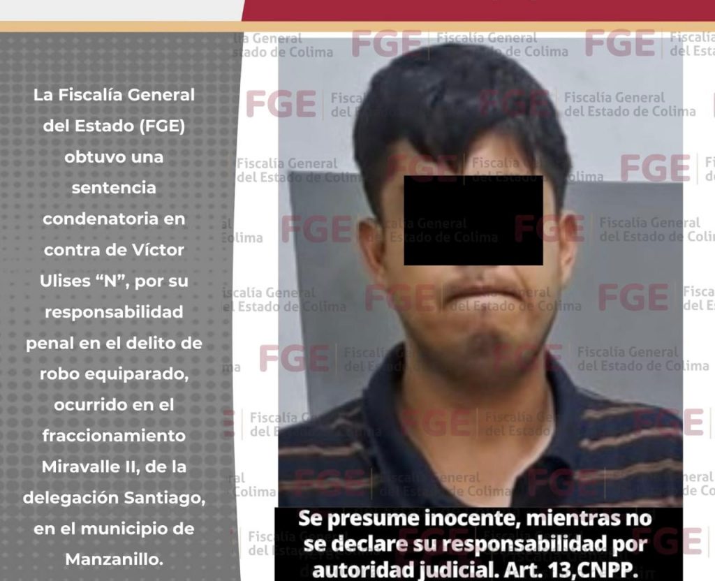 La Fiscalía General del Estado (FGE) obtuvo una sentencia condenatoria en contra de Víctor Ulises “N”, por su responsabilidad penal en el d3lit0 de robo equiparado, ocurrido en el fraccionamiento Miravalle II, de la delegación Santiago, en el municipio de Manzanillo.