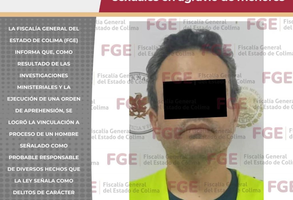 La Fiscalía General del Estado de Colima (FGE) informa que, como resultado de las investigaciones ministeriales y la ejecución de una orden de aprehensión, se logró la vinculación a proceso de un hombre señalado como probable responsable de diversos hechos que la ley señala como d3l1t0s de carácter s3xu4l cometidos en @gr@v1o de m3n0r3s de 3dad.