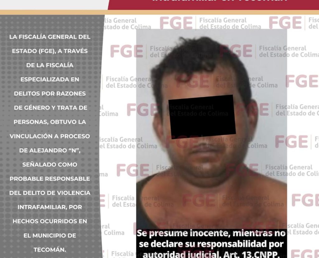 La Fiscalía General del Estado (FGE), a través de la Fiscalía Especializada en D3l1t0s por Razones de Género y Tr4t@ de Personas, obtuvo la vinculación a proceso de Alejandro “N”, señalado como probable responsable del d3l1t0 de v10l3ncia intr@f@miliar, por hechos ocurridos en el municipio de Tecomán.