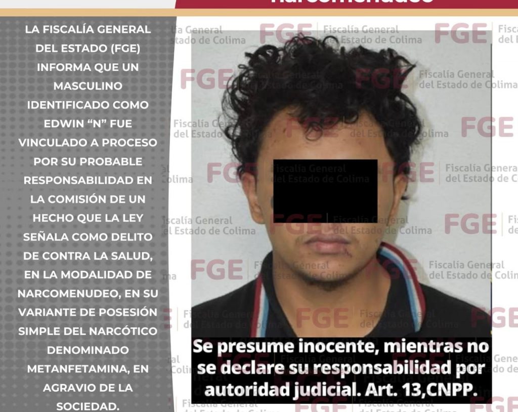 La Fiscalía General del Estado (FGE) informa que un masculino identificado como Edwin “N” fue vinculado a proceso por su probable responsabilidad en la comisión de un hecho que la ley señala como d3lito de contra la salud, en la modalidad de n4rcom3nudeo, en su variante de posesión simple del n4rcót1c0 denominado m3t4nfetamin@, en agravio de la sociedad.