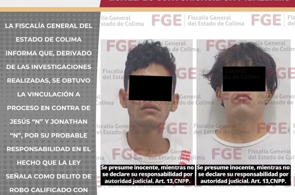 La Fiscalía General del Estado de Colima informa que, derivado de las investigaciones realizadas, se obtuvo la vinculación a proceso en contra de Jesús “N” y Jonathan “N”, por su probable responsabilidad en el hecho que la ley señala como delito de robo calificado con v10l3ncia y uso de 4rm@.