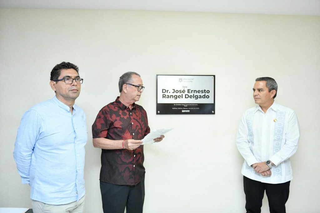 Esta semana, en la Sala de juntas del Centro Universitario de Investigaciones y Estudios sobre la Cuenca del Pacífico (CUEICP-CEAPEC), el rector de la Universidad de Colima, Christian Jorge Torres Ortiz Zermeño develó una placa que lleva inscrito el nombre de José Ernesto Rangel Delgado, quien a lo largo de su vida académica contribuyó no sólo a la formación de estudiantes y a la investigación sobre las economías de la Cuenca del Pacifico, sino también al trabajo administrativo.
