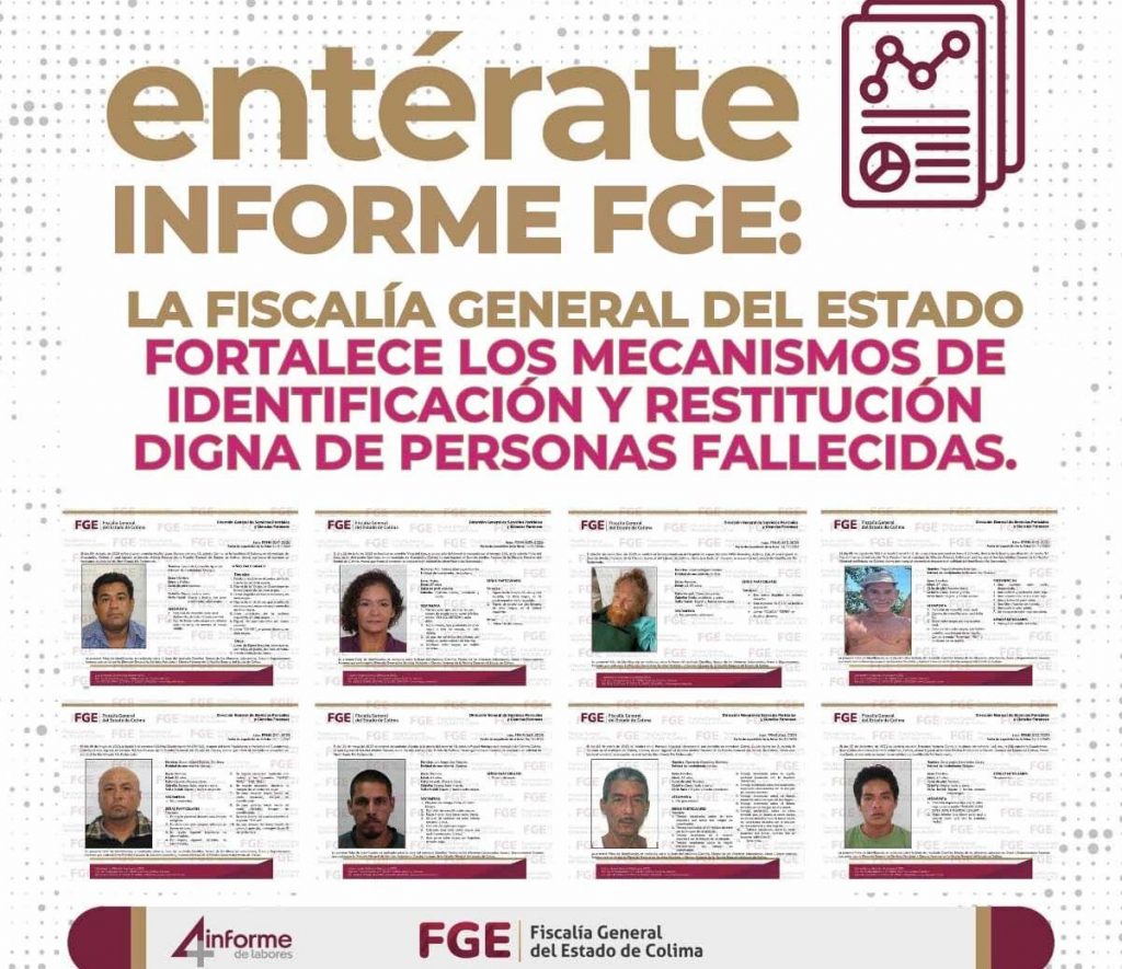 Como parte de los procesos de identificación forense de personas fallecidas y de la coordinación institucional para su destino final, la Fiscalía General del Estado de Colima ha diseñado un espacio de difusión que facilita la localización de familiares y la entrega digna de personas fallecidas no reclamadas. Este esfuerzo aprovecha el alcance que ofrecen la tecnología y las redes de comunicación actuales.