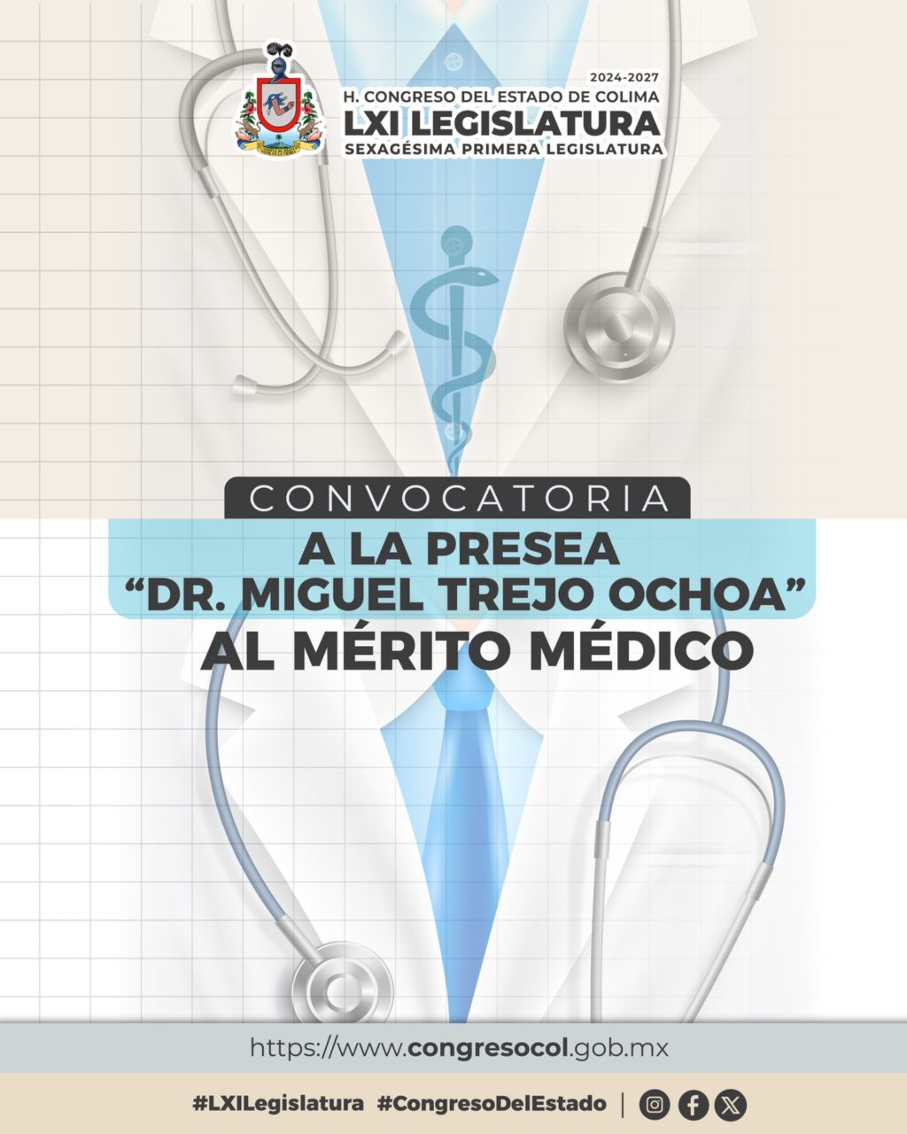 Este próximo lunes 13 de octubre vence el plazo para la convocatoria de la Presea “Dr. Miguel Trejo Ochoa”, que se entrega a las personas con destacada trayectoria y aportaciones en el ámbito médico en Colima; por lo que el H. Congreso del Estado de Colima, reitera la invitación para que participen e inscriban sus propuestas las y los profesionales de la salud.