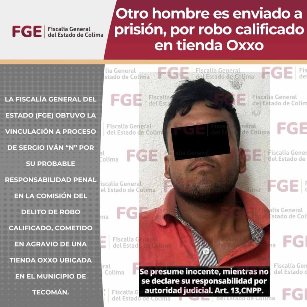 La Fiscalía General del Estado (FGE) obtuvo la vinculación a proceso de Sergio Iván “N” por su probable responsabilidad penal en la comisión del delito de robo calificado, cometido en agravio de una tienda Oxxo ubicada en el municipio de Tecomán.