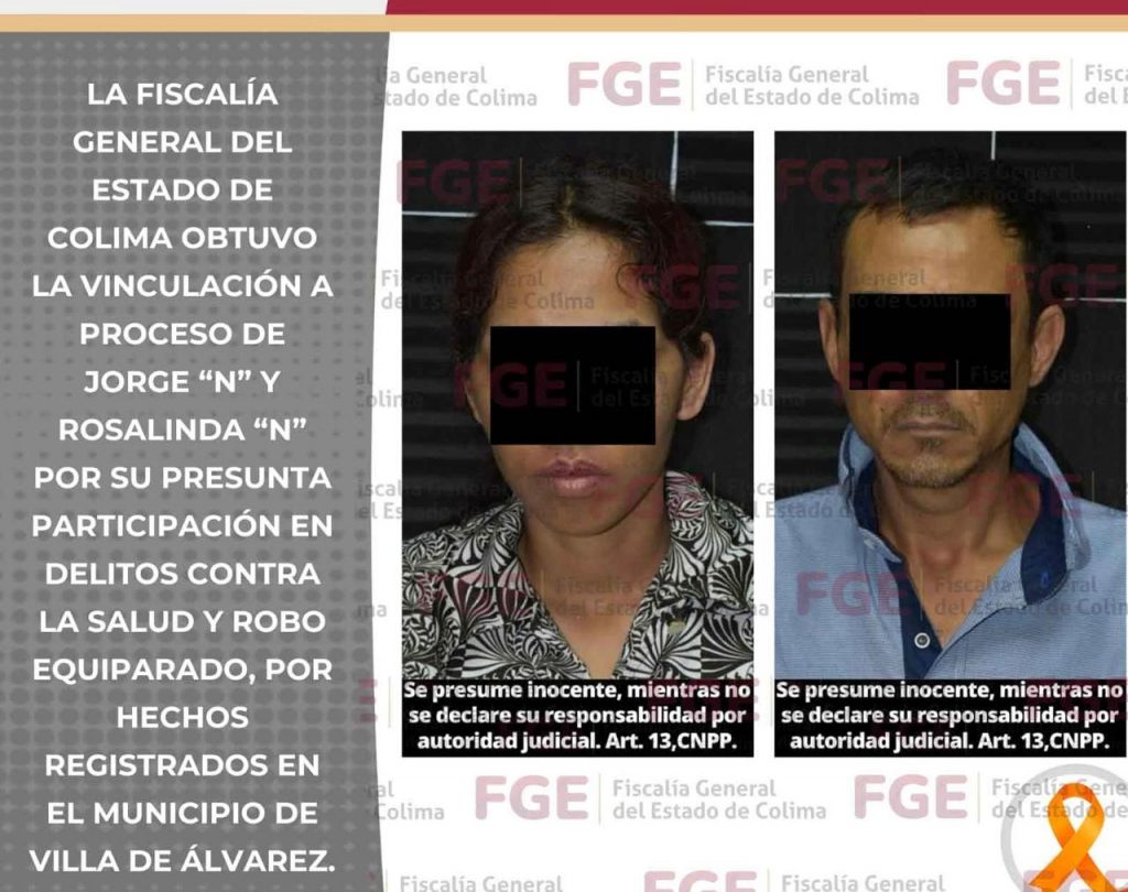 La Fiscalía General del Estado de Colima obtuvo la vinculación a proceso de Jorge “N” y Rosalinda “N” por su presunta participación en d3lit0s contra la salud y robo equiparado, por hechos registrados en el municipio de Villa de Álvarez.