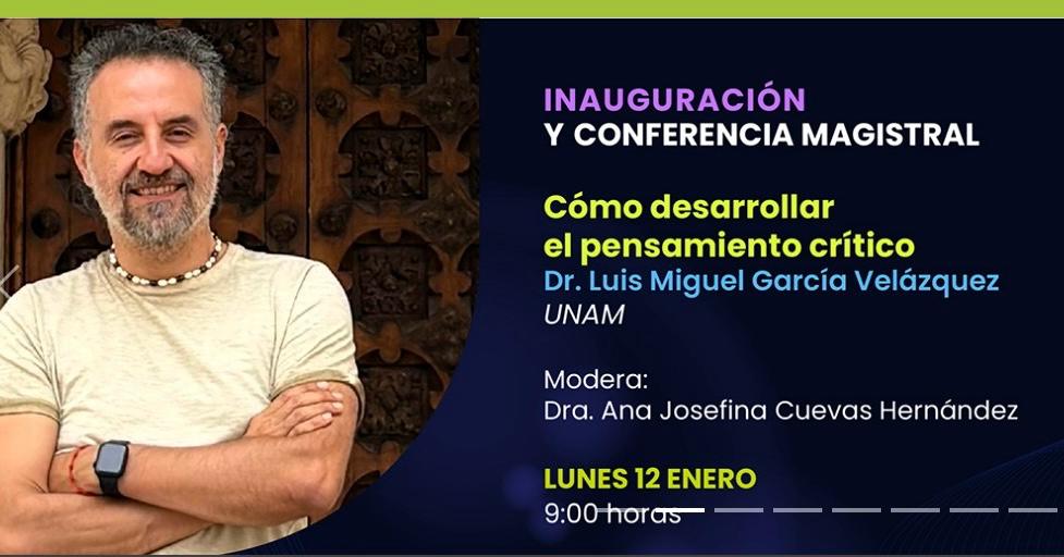 La conferencia inaugural: “Cómo desarrollar el pensamiento crítico”, que impartirá el Dr. Luis Miguel García Velázquez, de la UNAM, se impartirá este 12 de enero, a partir de las 9 de la mañana, en modalidad virtual. Será moderada por la Dra. Ana Josefina Cuevas Hernández.