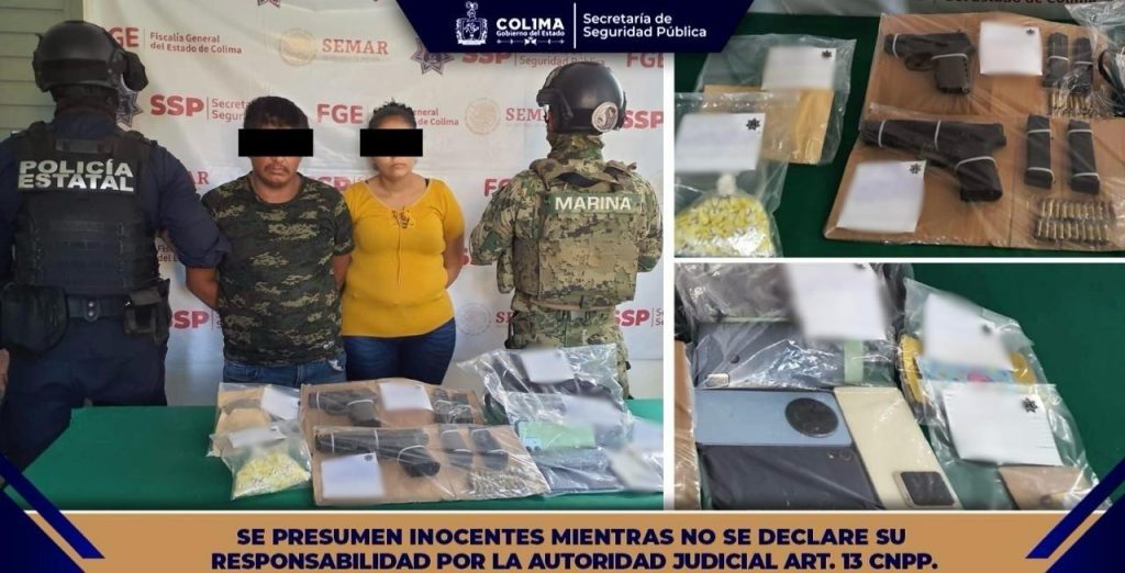 La Secretaría de Seguridad Pública (SSP) del Gobierno del Estado de Colima informa que agentes operativos de la Policía Estatal Preventiva (PEP), en coordinación con personal de la Secretaría de Marina (Semar), detuvieron en el municipio de Tecomán a una pareja por d3lit0s contra la salud y V10l@ción a la Ley Federal de 4rm@s de Fu3g0 y 3xpl0s1vos.