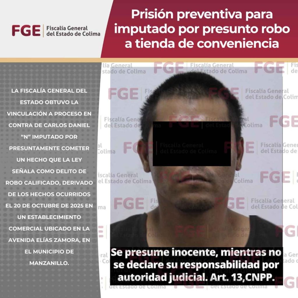 La Fiscalía General del Estado obtuvo la vinculación a proceso en contra de Carlos Daniel “N” imputado por presuntamente cometer un hecho que la ley señala como delito de robo calificado, derivado de los hechos ocurridos el 20 de octubre de 2025 en un establecimiento comercial ubicado en la avenida Elías Zamora, en el municipio de Manzanillo.