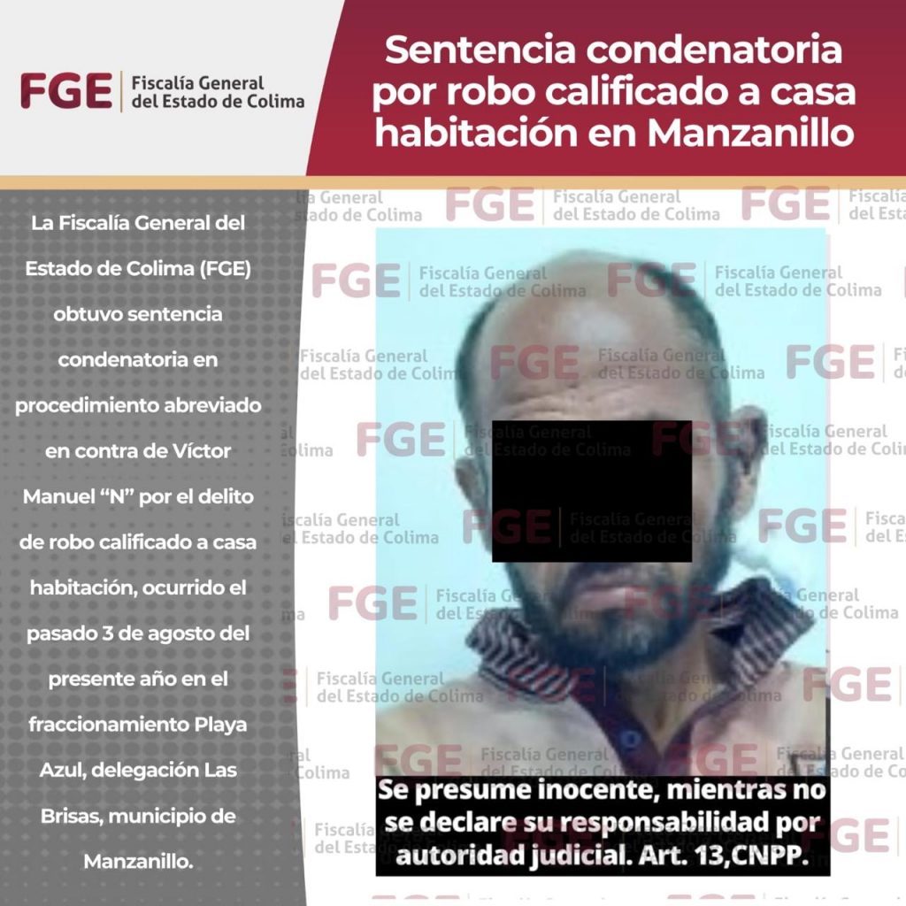 La Fiscalía General del Estado de Colima (FGE) obtuvo sentencia condenatoria en procedimiento abreviado en contra de Víctor Manuel “N” por el d3l1to de robo calificado a casa habitación, ocurrido el pasado 3 de agosto del presente año en el fraccionamiento Playa Azul, delegación Las Brisas, municipio de Manzanillo.