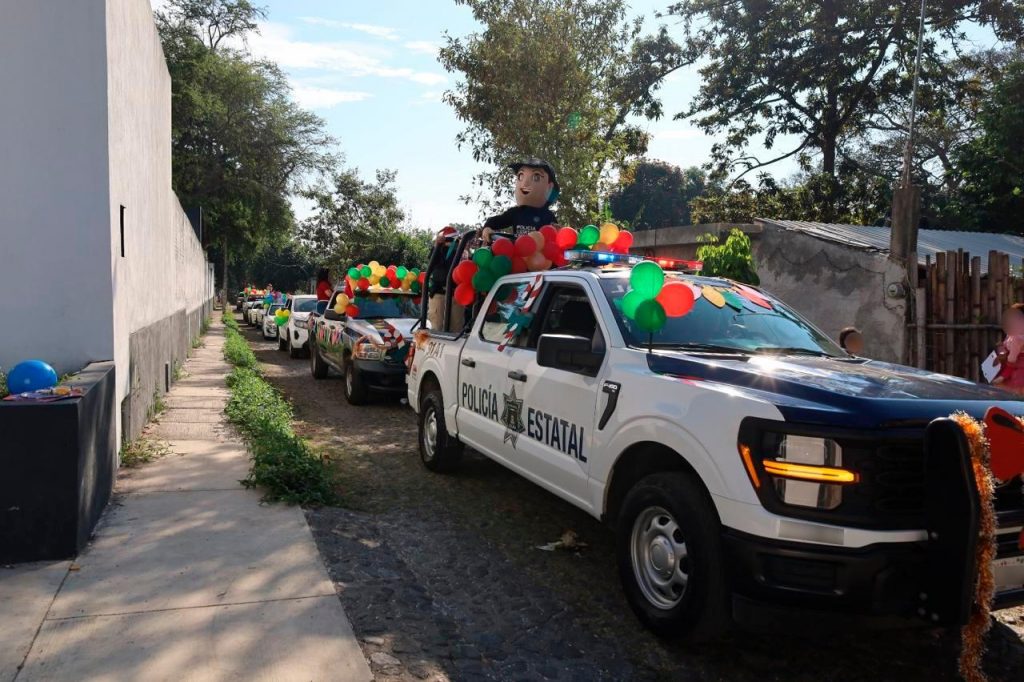 El recorrido se realizó por las principales calles de las comunidades, concluyendo en la escuela primaria Constitución, ubicada en calle Tepehuajes en Cofradía de Suchitlán, donde niñas, niños y familias participaron activamente en esta celebración preventiva y cultural.