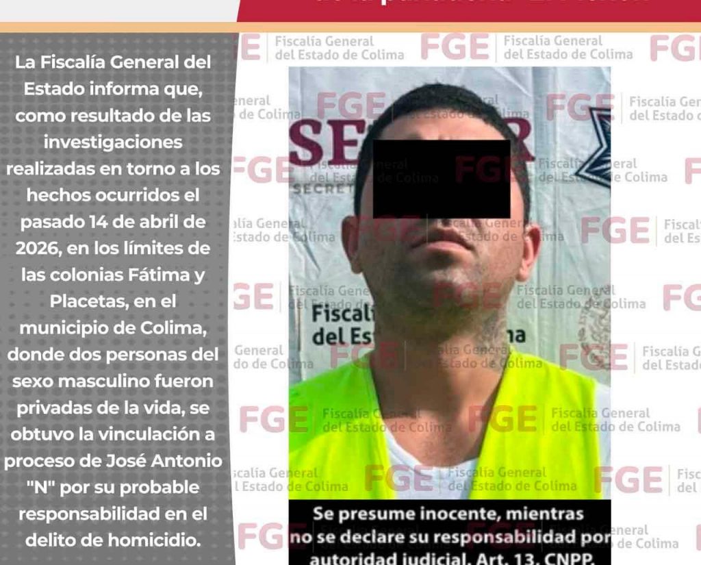 La Fiscalía General del Estado informa que, como resultado de las investigaciones realizadas en torno a los hechos ocurridos el pasado 14 de abril de 2026, en los límites de las colonias Fátima y Placetas, en el municipio de Colima, donde dos personas del sexo masculino fueron privadas de la vida, se obtuvo la vinculación a proceso de José Antonio “N” por su probable responsabilidad en el d3l1t0 de hQm1cidiQ.