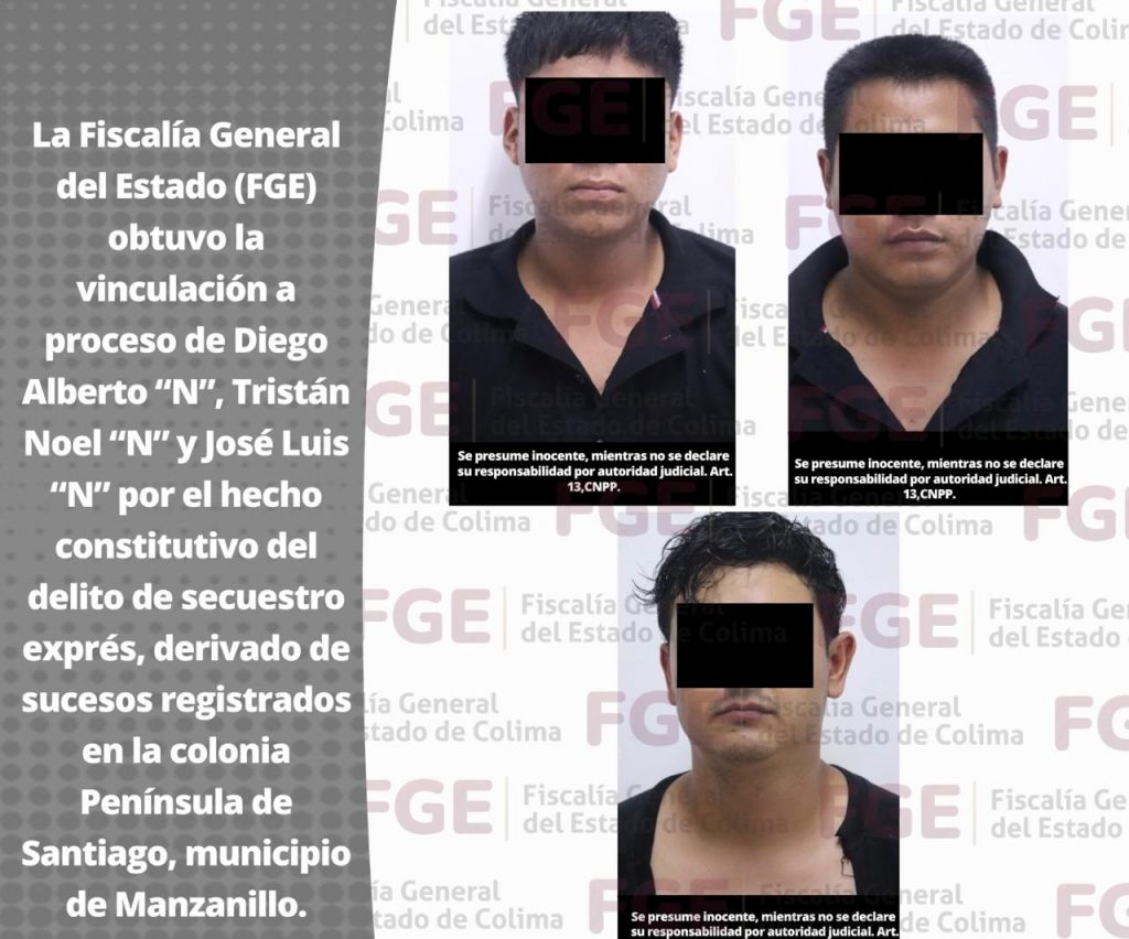 La Fiscalía General del Estado (FGE) obtuvo la vinculación a proceso de Diego Alberto “N”, Tristán Noel “N” y José Luis “N” por el d3l1to de s3cu3str0 exprés, derivado de hechos registrados en la colonia Península de Santiago, municipio de Manzanillo.